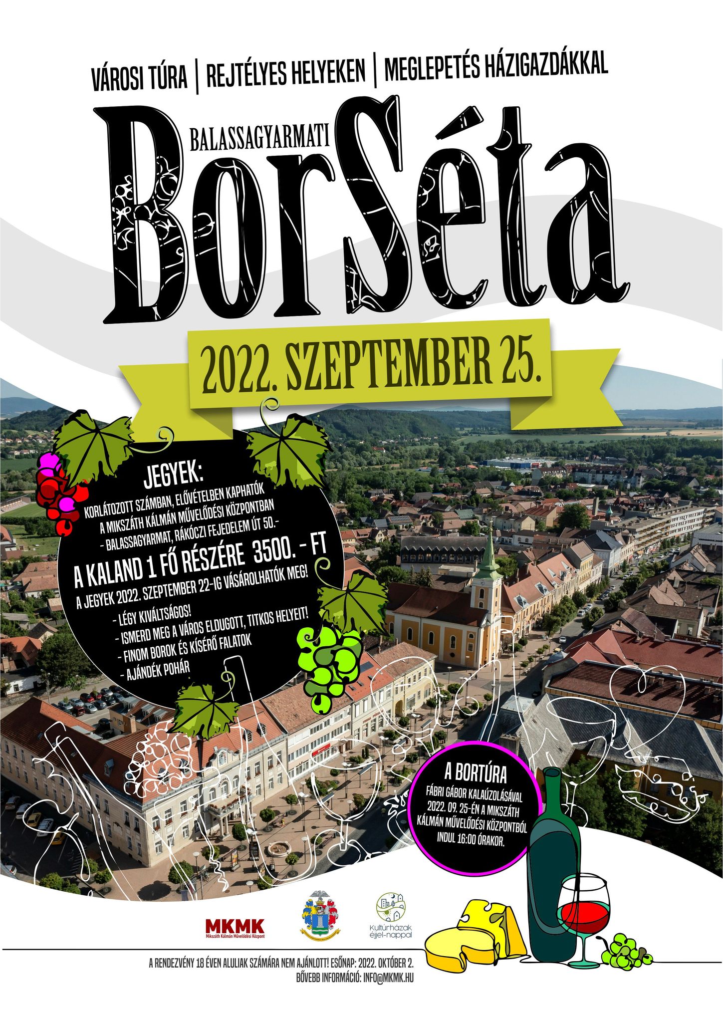 Sétánk során bejárjuk Balassagyarmat eldugott, titokzatos helyeit, miközben finom borokat és borkorcsolyákat kóstolunk a szüreti időszak, illetve Szent Mihály nap alkalmából. A kulturális, városi borsétát Fábri Gábor geográfus vezeti, öt helyszínt látogatunk meg, ahol meglepetés házigazdák várják a résztvevőket. A program 18 éven felüliek számára látogatható.